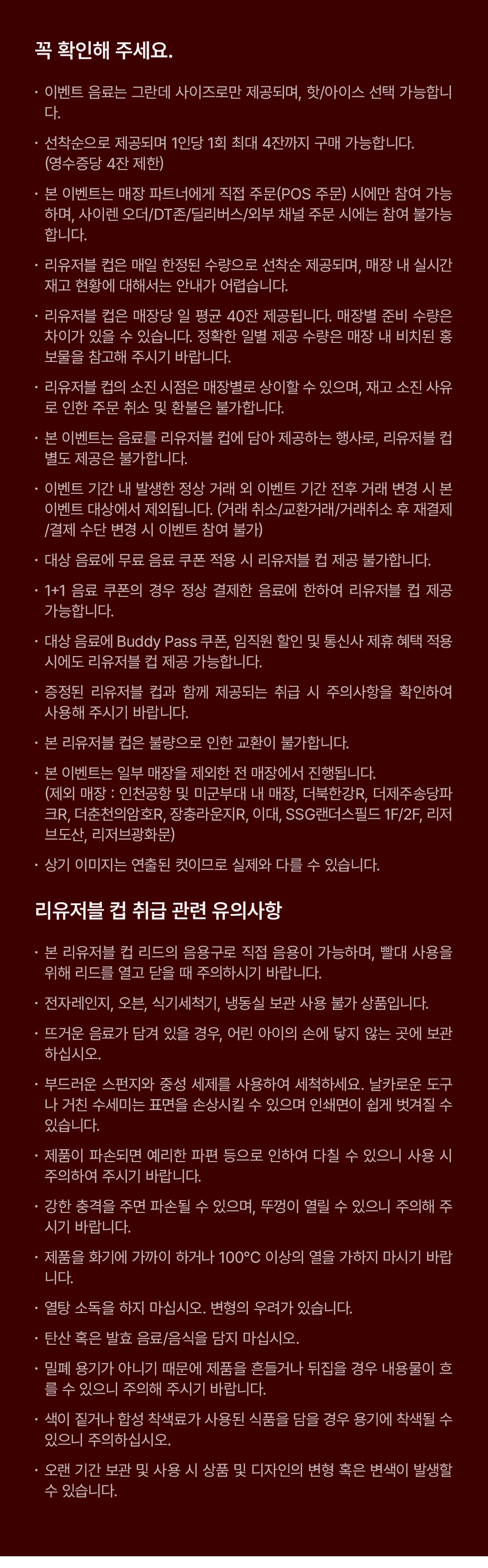 - 무료 음료 쿠폰: 사용 시 리유저블 컵 제공 불가