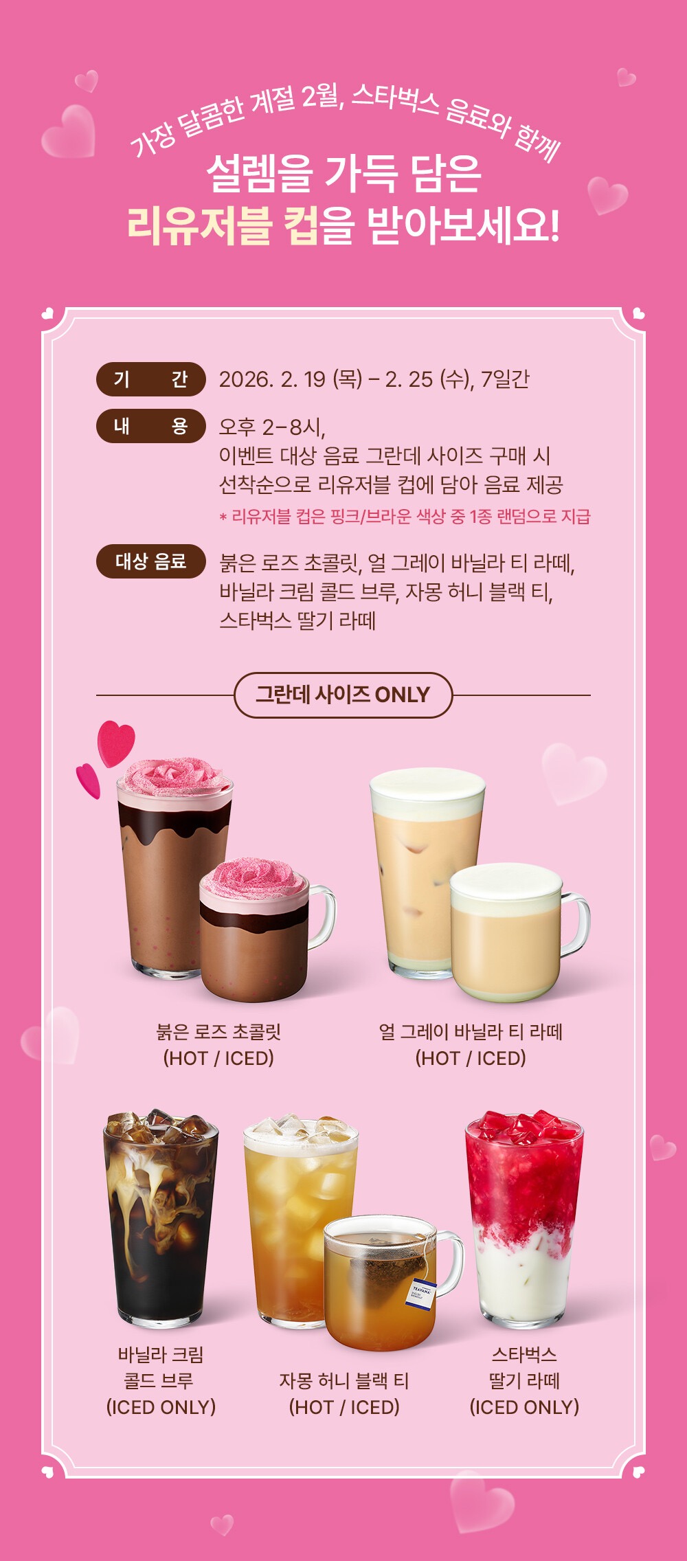 모든 음료가 해당되는 것은 아닙니다. 아래 5가지 음료 중 하나를 선택하셔야 하며, 반드시 그란데(Grande, 473ml) 사이즈로 주문해야 합니다.