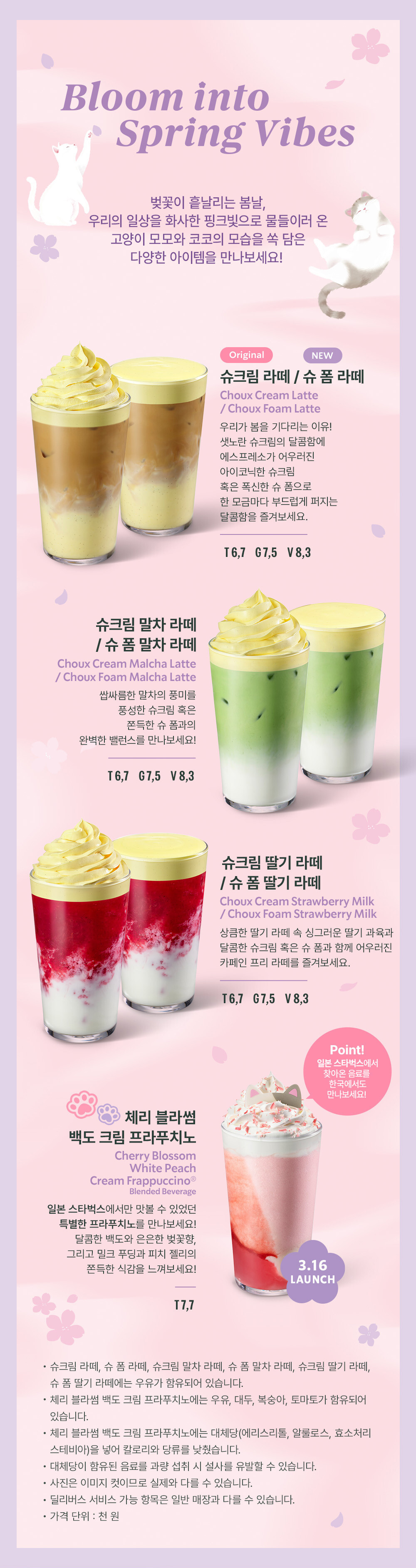 - 슈크림 라떼 / 슈 폼 라떼 (T 6.7 / G 7.5 / V 8.3) 스타벅스 봄의 상징! 달콤하고 부드러운 슈크림이 에스프레소와 완벽한 조화를 이루는 시그니처 메뉴입니다.