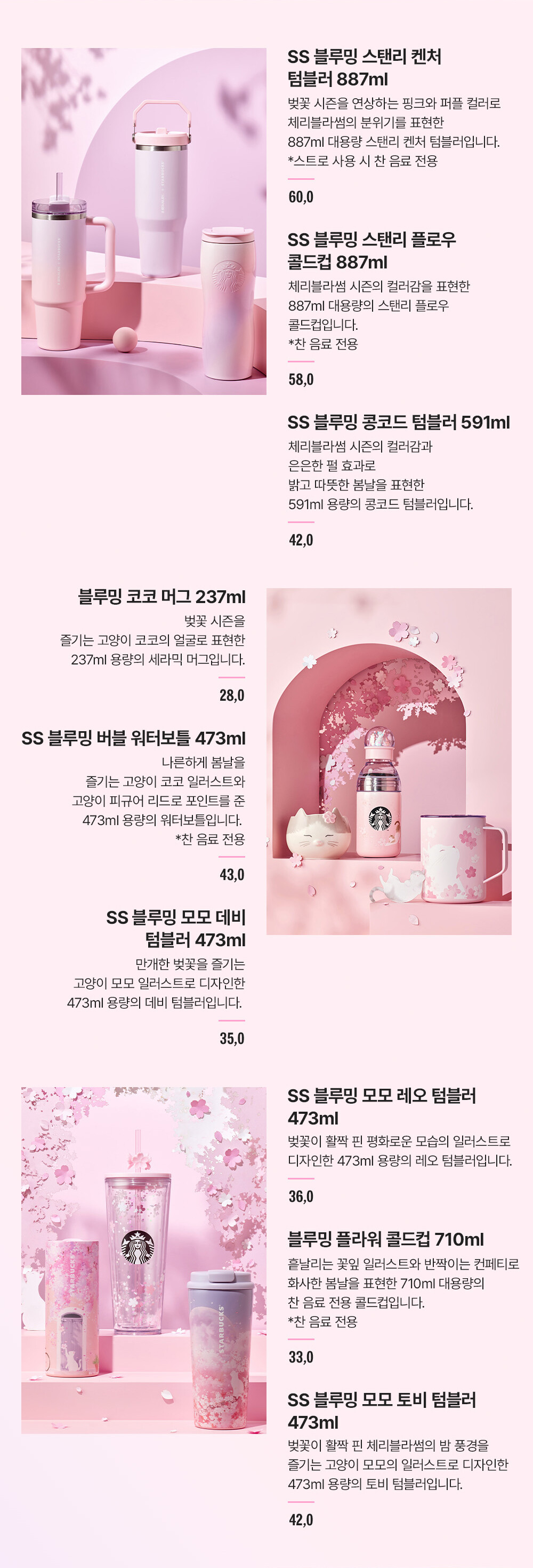 | SS 블루밍 모모 레오 텀블러 | 473ml | 36,000원 | 평화로운 벚꽃 일러스트 |