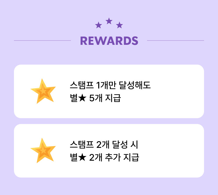- 스탬프 1개 달성 시: 별 ★ 5개 증정