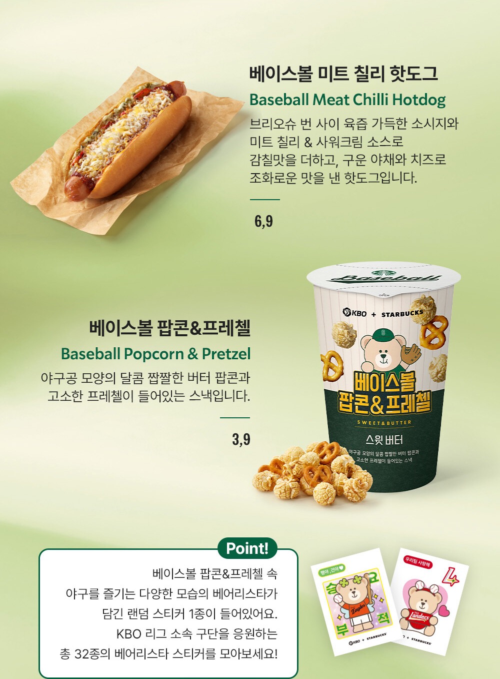 - "베이스볼 팝콘 & 프레첼" (3.9) 야구공 모양의 달콤 짭짤한 스윗버터 팝콘과 고소한 프레첼 조합의 스낵입니다. "💡 구매 포인트:" 스낵 안에 KBO 구단을 응원하는 32종의 "베어리스타 랜덤 스티커" 중 1종이 들어있습니다. 내 응원팀 스티커를 뽑는 재미를 놓치지 마세요!