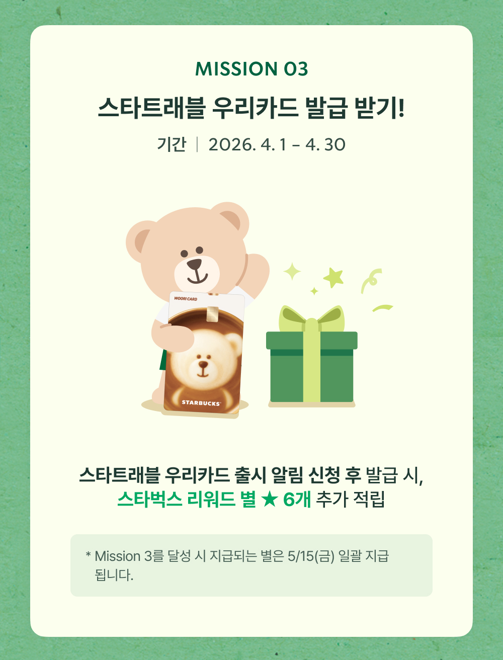 - 별 지급일: 미션 3 달성 시 "5월 15일(금)" 일괄 지급