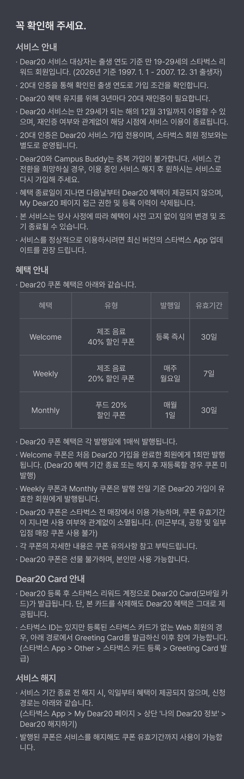 - "혜택 확인:" 앱 Home 화면의 Dear20 배너를 클릭하여 "My Dear20" 페이지에서 보유 쿠폰과 혜택 종료일을 확인합니다.