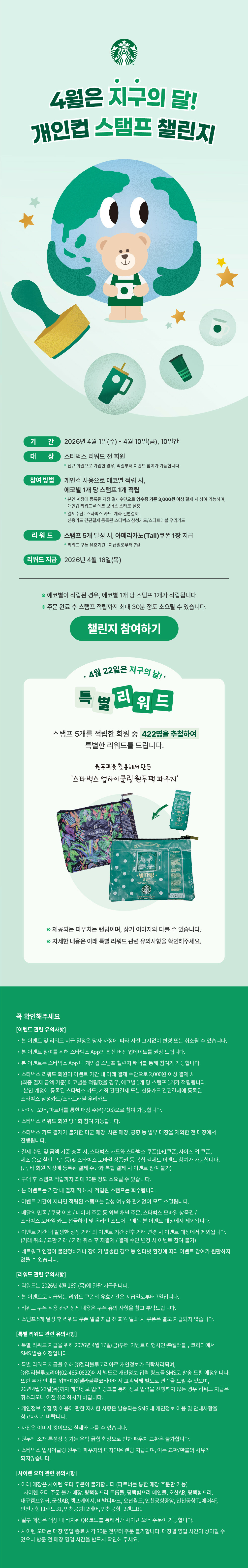 다가오는 4월 22일 지구의 날을 기념하여, 스탬프 5개를 모두 모은 회원 중 "422명"을 추첨해 특별한 선물을 증정합니다.