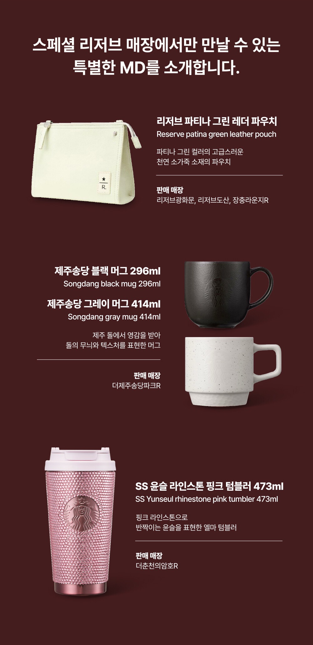 모든 스타벅스 매장에서 구할 수 없는, 오직 "특정 스페셜 리저브 매장"에서만 판매하는 특별한 MD 라인업입니다. 방문하시는 매장에 맞춰 굿즈를 구경하는 재미도 놓치지 마세요.