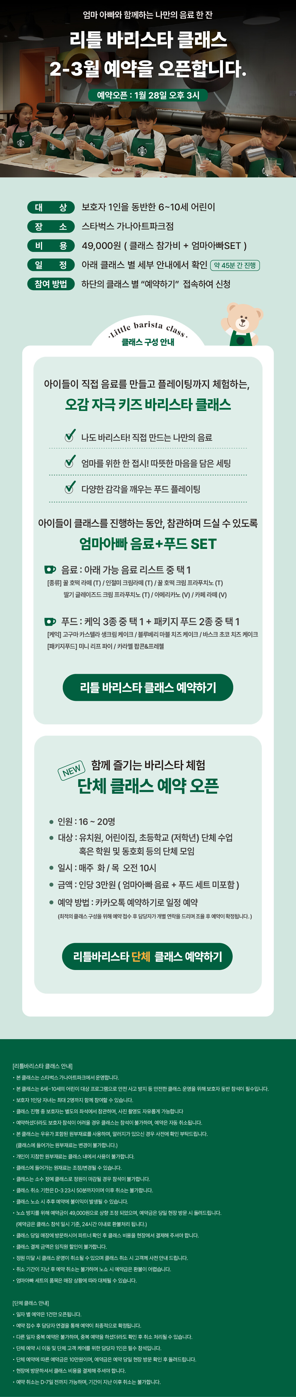 스타벅스에서 아이들을 위한 특별한 체험 프로그램인 **'리틀 바리스타 클래스'**의 2~3월 예약이 시작되었습니다. 특히 이번 클래스는 경기도 양주에 위치한 **'스타벅스 가나아트파크점'**에서 진행되어, 서울 근교 나들이를 계획하시는 분들께 아주 좋은 선택지가 될 것 같습니다.