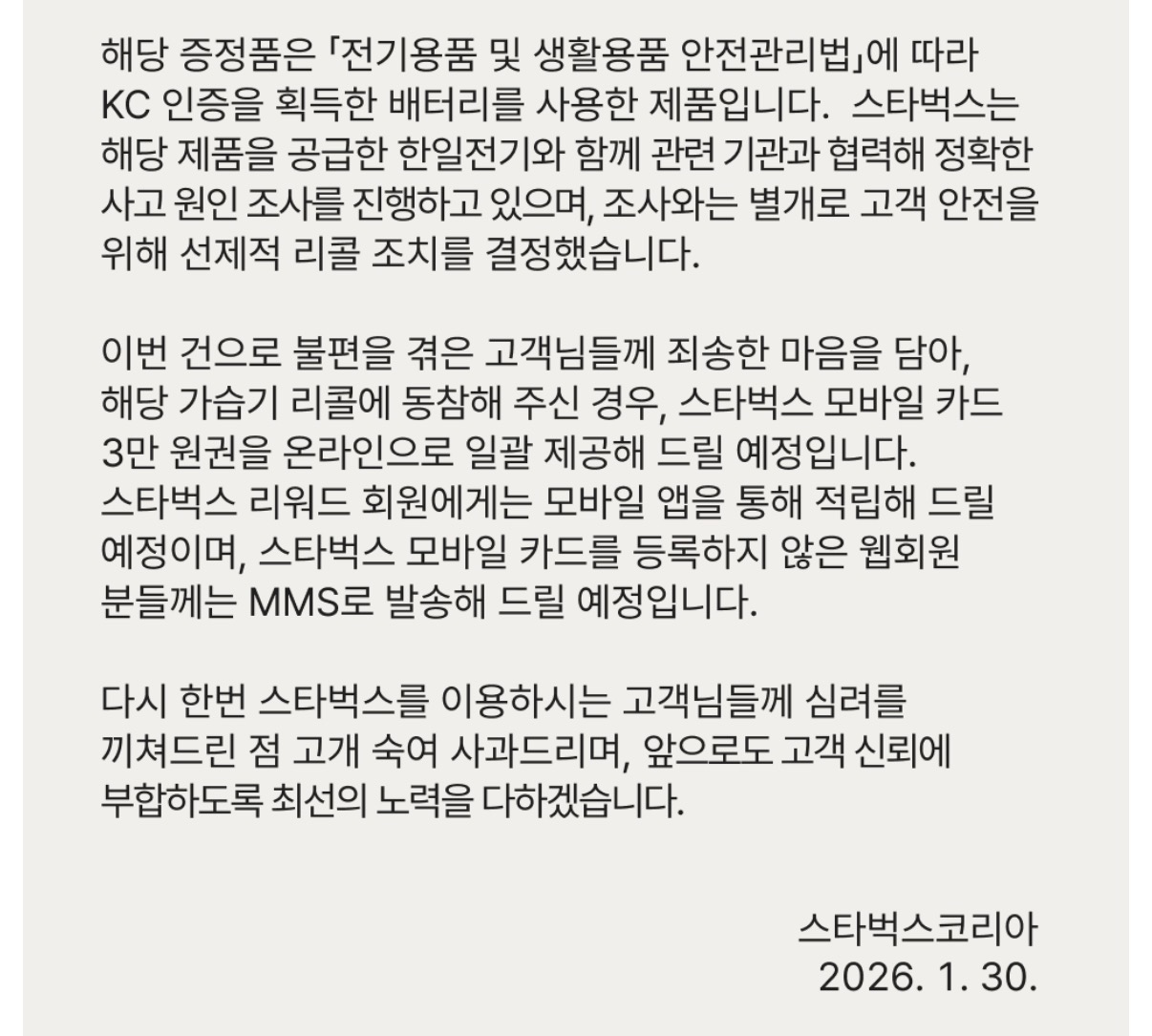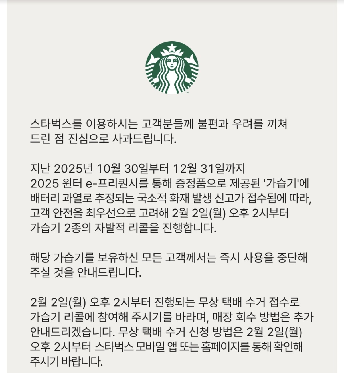 스타벅스 측의 공식 안내문에 따르면, 2025년 10월 30일부터 12월 31일까지 증정된 가습기 제품에서 배터리 과열로 추정되는 국소적 화재 신고가 접수되었습니다.