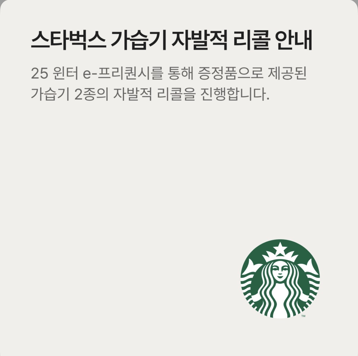 스타벅스 코리아가 지난겨울 '2025 윈터 e-프리퀀시' 증정품으로 제공했던 가습기에 대해 **자발적 리콜(회수)**을 결정했습니다.